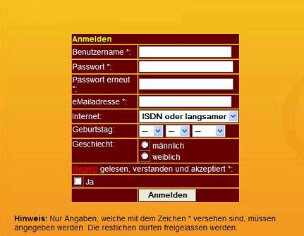 Wähle nun einen Benutzernamen und ein Passwort aus. Gib dann deine Gültige E-Mail-Adresse ein. (Achtung fehlerhafte, keine oder ungültige E-Mails werden kommentarlos und sofort gelöscht) Jetzt kannst du noch deine Internetverbindung, dein Geburtsdatum und dein Geschlecht angeben. Nun bestättige, dass Du mit den Regeln einverstanden bist und klicke auf den Button "Anmelden".
